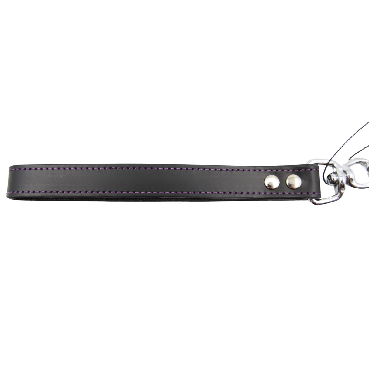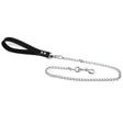 Cette laisse en chaîne de 3 pieds est dotée d'un connecteur pivotant et d'une poignée en cuir de 3/4" de large avec doublure en cuir souple.