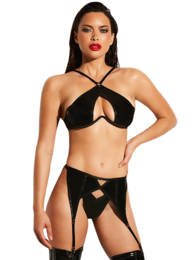Les détails en anneaux métalliques ajoutent une touche provocante et raffinée, évoquant l’univers du glamour audacieux et des jeux de pouvoir subtils. Chaque pièce se complète dans une harmonie sensuelle, révélant juste assez pour attiser le désir tout en laissant place à l’imagination.