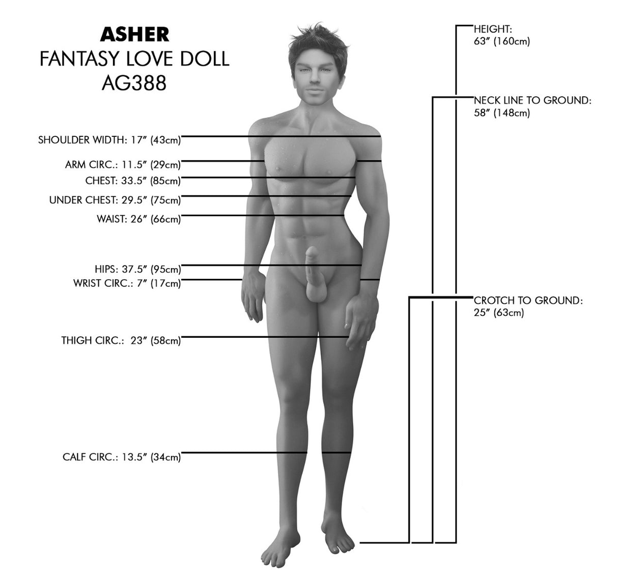 Glissez vos doigts dans l'une de ses 3 perruques, jouez avec ses mamelons et pressez fermement son cul! Transformez le en esclave sexuel et profitez son corps sans défauts. Habillez-le ou laissez-le nu, vous pouvez toucher, jouer et dire qu'il est toujours à vous!