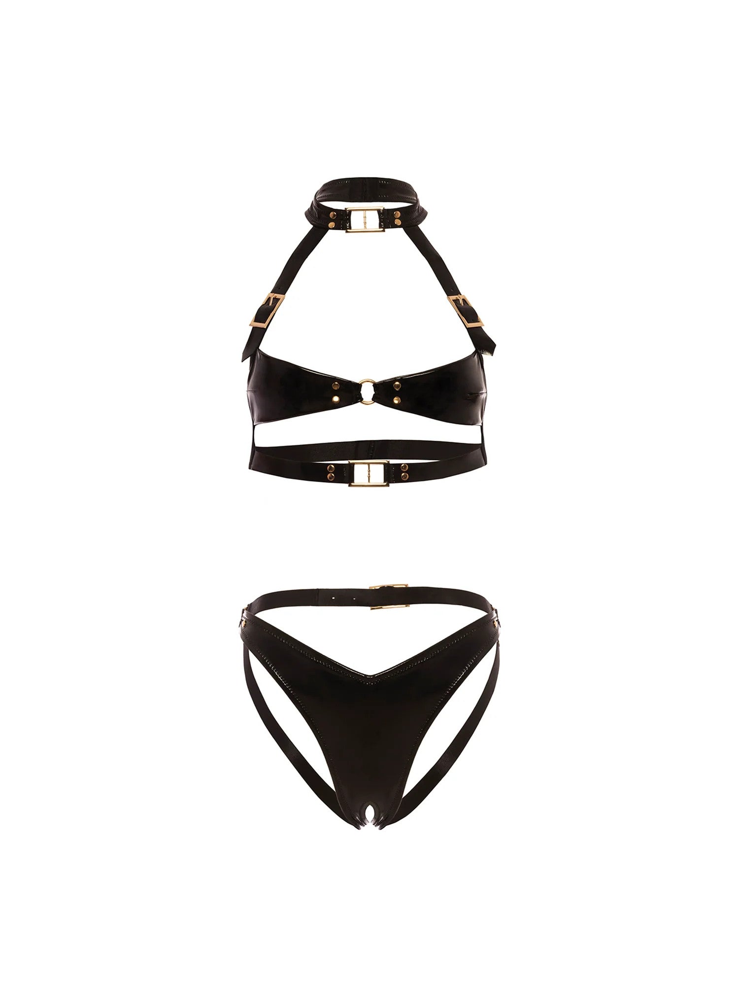 Affirmez votre audace avec l'ensemble Feisty 2 pièces en vinyle, une pièce électrisante qui sublime vos courbes. Les bonnets souples et le décolleté dos nu à col ajustable encadrent votre décolleté avec une touche provocante, tandis que le vinyle brillant capte la lumière, créant un effet seconde peau irrésistiblement glamour. Les détails de boucles ajoutent une note de fétichisme chic et assumé.