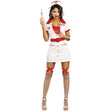 This costume includes a white and red mini dress that hugs your curves, a sleek red belt to structure your figure, and a red crop top decorated with an EKG pattern that adds a flirty touch. The look is completed with a white nurse hat and name tag to perfectly embody the role.