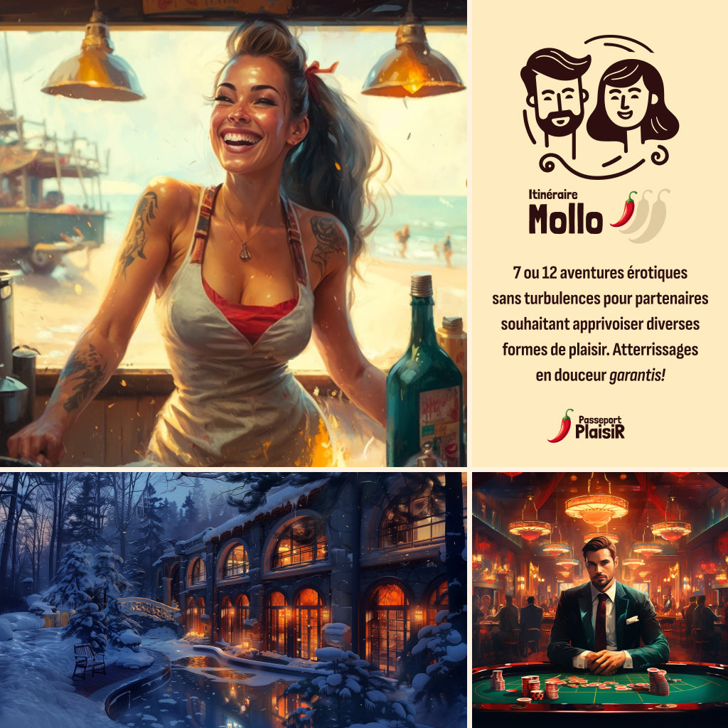 Alors l'itinéraire Mollo est pour vous. Ce voyage érotique maison vous transportera dans une série d'aventures coquines proposant chacune 2 activités érotiques à réaliser, dont l'une sur-le-champ.