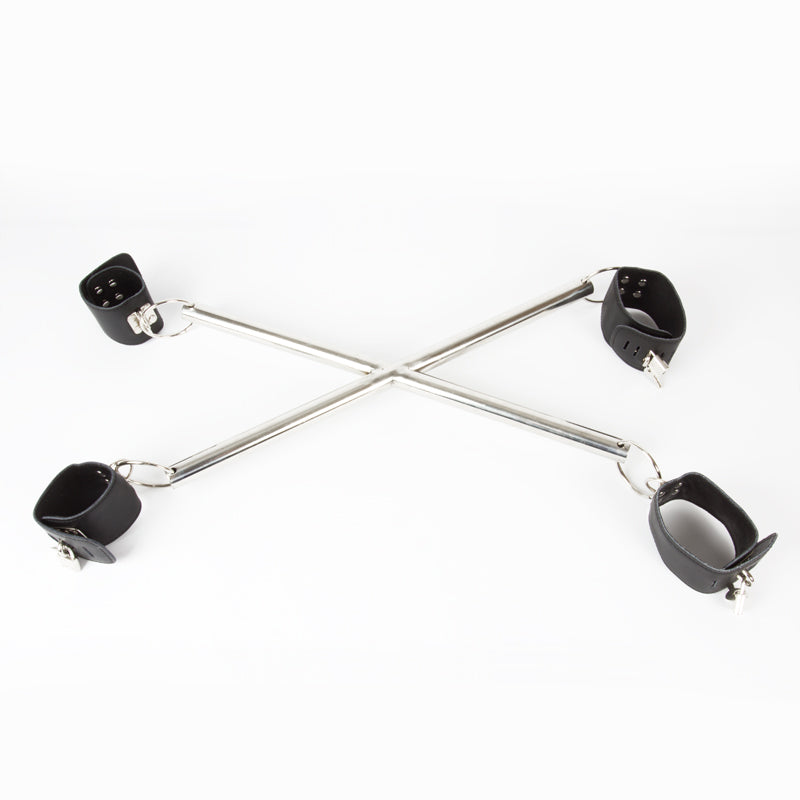 Comprend une barre de métal en X et quatre menottes de cuir reliées à la barre par des anneaux métalliques.