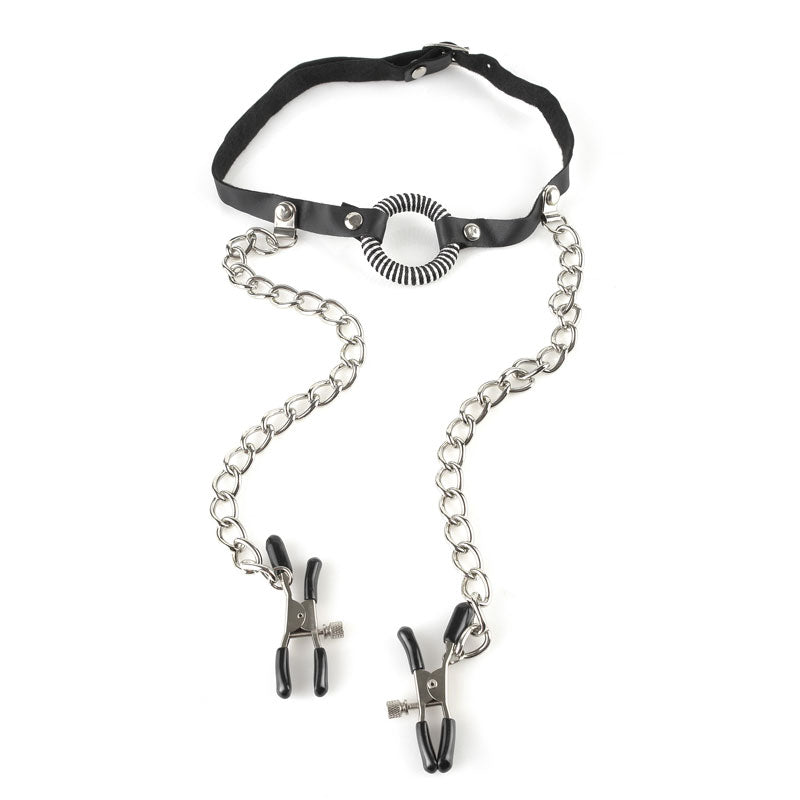 Le bâillon est constitué d’un petit anneau rond de métal recouvert de cuir et relié à deux sangles robustes en cuir s’ajustant à la plupart des tailles et procurant la tension adéquate pour garder la bouche ouverte. Deux chaînes métalliques munies de pinces à mamelons sont reliées au bâillon et stimulent doucement les mamelons. Les pinces avec doublure de caoutchouc s’ajustent aisément pour jouir de la tension désirée. Bandeau pour les yeux inclus