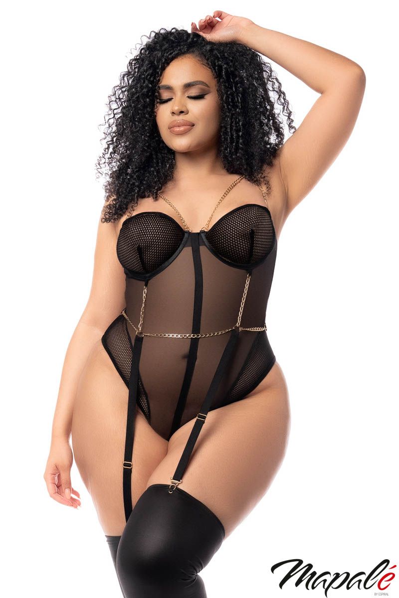 Teddy en maille transparente avec des chaînes dorées et un élastique épais sur le corsage, des bretelles réglables, une résille autour du dos ouvert plongeant, des chaînes dorées autour des bonnets en résille à armatures, 2 fermetures à crochet et à œillet, une fermeture à crochet et à œillet à l'entrejambe et des jarretelles réglables attachées .
