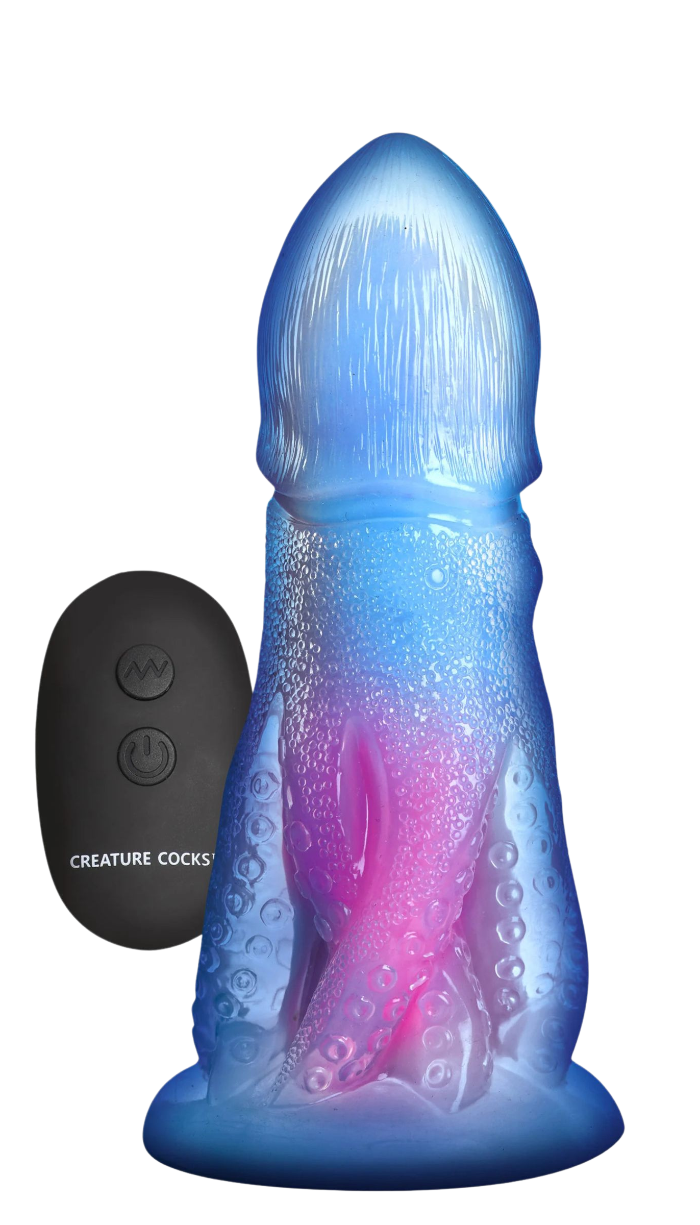 Dive into an experience worthy of the deep sea with the Cocktopus Deluxe Glow-in-the-Dark Vibrating Silicone Dildo, a spectacular creation inspired by the mysterious creatures of the ocean. Its impressive design evokes a living tentacle that seems to unfurl gracefully, while its captivating marine hues and sculpted details create an object as fascinating to behold as it is to use.