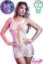 Glow even in the dark with the Glow Lace Dress, a short dress in luminescent floral lace that reveals your sensuality in a new light. Its plunging neckline is adorned with crisscross elastic bands, while its open strappy sides and thick fixed straps create a daring and seductive effect.